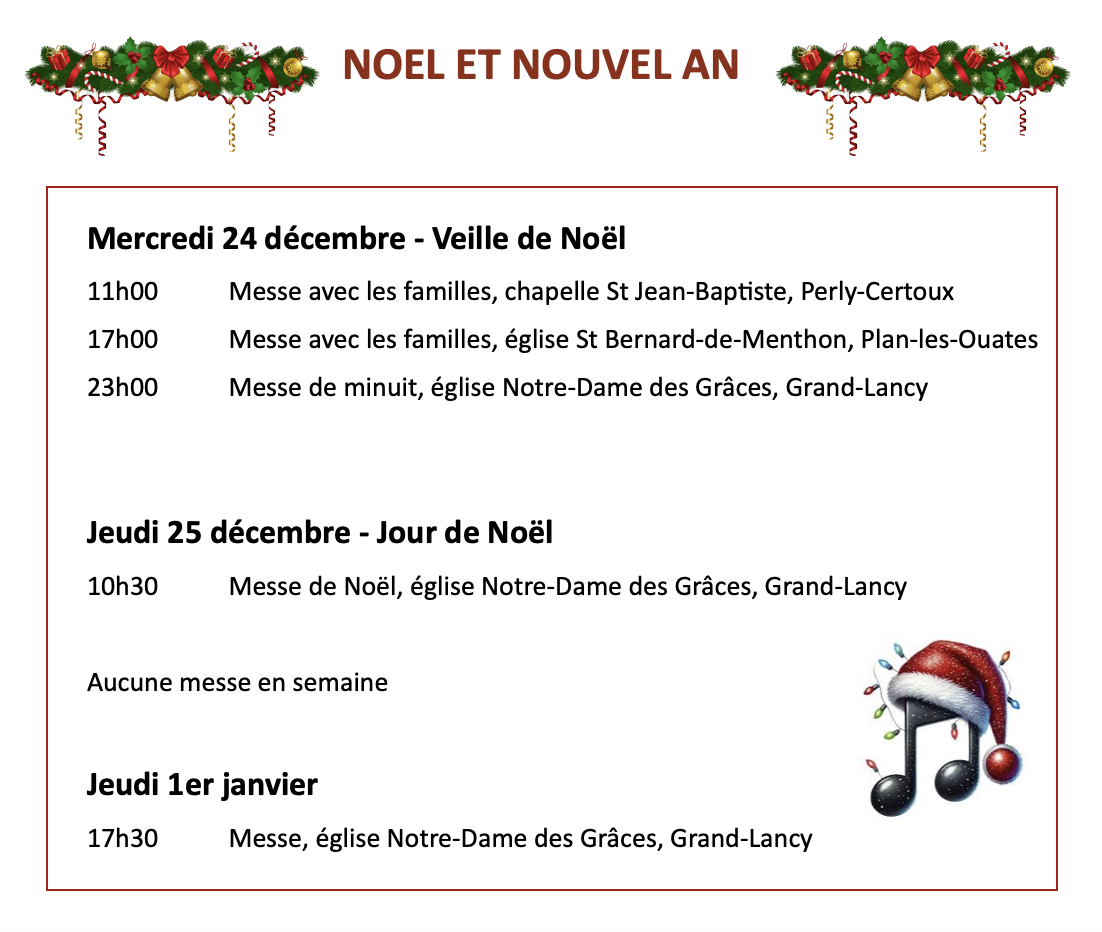 Jeudi 1er janvier 2026 – Nouvel An : Messe, 18h30, église Notre-Dame des Grâces