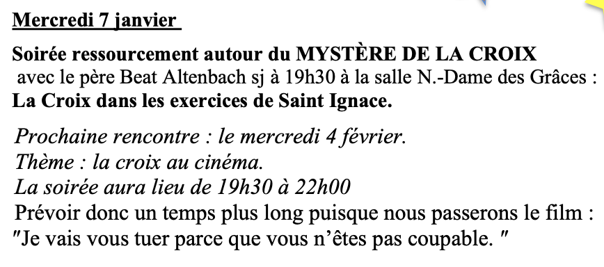Dimanche 11 janvier : Groupe confirmation 2024-2026, 17h30, Salle de Notre-Dame des Grâces