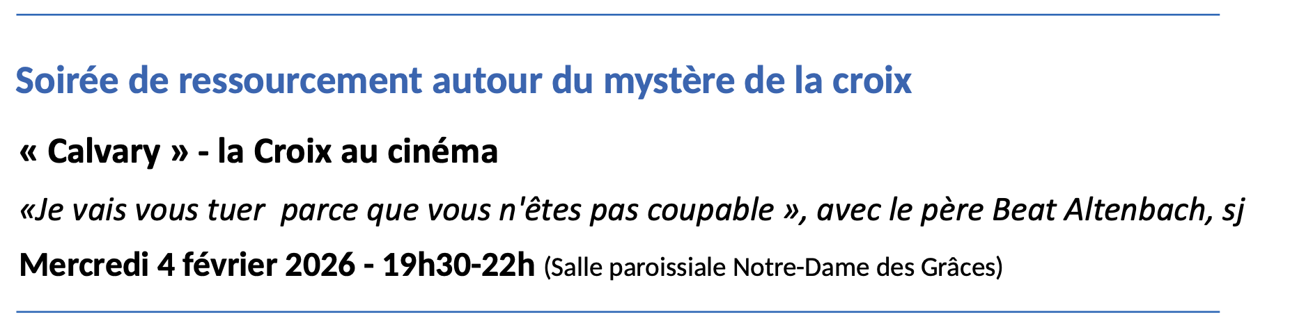 Soirée ressourcement autour du MYSTÈRE DE LA CROIX, avec le père Beat Altenbach sj, de 19h30 à 22h00 à la salle N.D. des Grâces. Projection du film « CALVARY », la croix au cinéma.